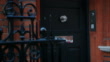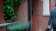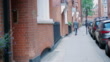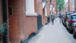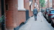 Man wearing grey suit walking down street with Wire Fox Terrier in London, England.