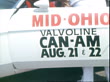 Mid-Ohio Road Race Course sign with illustrations of Can-Am, Continental, and Trans-Am class race cars at Mid-Ohio Sports Car Course / mechanics working on Stewart's L&M sponsored Lola T260 Chevrolet #1 / tail of McLaren M8F Chevrolet, tilt up to driver PETER REVSON wearing dirty racing jumpsuit while seated on wooden bench, talking with several men, pan left to McLaren mechanics working on Can-Am car; Peter Revson signing poster for fan / McLaren M8F Chevrolet #7 / young man shooting with 16mm film camera / Porsche 917 10 #20 parked in line / driver JO SIFFERT sporting mustache, sunglasses, racing jumpsuit / Tilting mechanics working on L&M sponsored Lola T260 Chevrolet #1 / crowd milling about Can-Am cars /driver JACKIE STEWART sporting dark sunglasses, black snap brim cap, racing jumpsuit while walking through crowd / Mid-Ohio Valvoline Can-Am, Aug 21 & 22 written on door of pace car / Jackie Stewart donning protective balaclava; Jackie Stewart on Can-Am car; Jackie Stewart being buckled with seat belt / mechanics working on Porsche 917 #20, Jo Siffert behind wheel / two men leaning over, talking with Tony Adamowicz behind wheel of McLaren M8B Chevrolet #54. 1971 Mid-Ohio Can-Am and Trans-Am on January 01, 1971 in Lexington, Ohio (Footage by Getty Images)