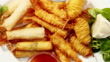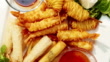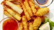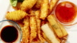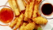Overhead shot of a plate of tasty appetisers spinning under camera.