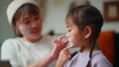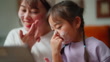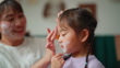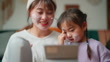 A mother is enjoying doing beauty skin care and relaxing with her small daughter in the living room at home.
