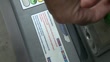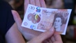 New ten pound note in use at bookshop / Protests over use of tallow in plastic note; ENGLAND: London: Hatchards:INTNew ten pound (£10) plastic note (£10) being used in bookshop to buy Jane Austen book / Customer buying book / close shot note showing Jane Austen side / book sale transaction taking place / book handed over counter / plastic ten pound note being exchanged between hands / ten pound note EXTMan using 'Nationwide' cash machine (ATM) and withdrawing new ten pound note / people using touchscreen cash machines / machine dispensing notes / protesters with placards including 'No blood in our money' and 'Stop making money from murder' (Demonstrating against use of tallow in plastic bank notes)