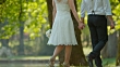 Slow motion medium tilt up shot of a husband and wife holding hands and walking in the park on their wedding day.