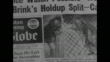 Title: "Paramount News - F.B.I. Solves Brink's Robbery" superimposed over Lady Justice / MS man at photo-transmitting machine at Associated Press Newsroom, pan to men talking on phones at news desk / Back view of man looking at photo of four of the eleven robbers: Stanley Albert Gusciora; Michael Vincent Geagan; James Ignatius Faherty; and Joseph Sylvester Banfield / CU photo of same 4 robbers / VS CU man looks at picture of the 7 others of the 11 robbers: Vincent James Costa; Adolph Maffie; Anthony Pino and Henry Baker on the top row - on the bottom row: Thomas Francis Richardson; Joseph James ("Specs") O'Keefe and Joseph F. McGinnis / CU photo moving on machine shows thin robber being arrested / CU thin robber being arrested / CU moving photo of heavy robber being arrested / CU photo of heavy robber being arrested / EXT. PAN from building to another building in Boston / MS reporters in street / Boston newspaper headline: Huge Manhunt, etc. / PAN Boston Globe showing drawings of robbers / VS man wearing mask like robbers wore coming out of door / Note: exact day not known