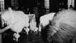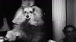 Poodles on tables being groomed at the Canadian Poodle Association competition / groomer putting makeup on dog's face / women in poodle skirts walking poodles during judging / judges seated in a row / winner presented with award / black poodle with rosette on chest Canadian Poodle Association competition on March 24, 1958