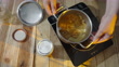 Pressure-caramelised onion. Emptying pressure-cooked Mason jars with pressure-caramelised onions. Ingredients are julienned yellow onions, baking soda and unsalted butter. Cooking pan on induction burner. Ready to reduce liquid to syrup.