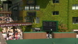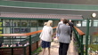 PAN out shot of Prince William, Catherine, Princess of Wales, Prince George, and Princess Charlott along with Hewitt across bridge / ZOOM out to of Centre Court exterior / Shots of court 4 with doubles tennis being played and empty courts 5,6,7