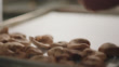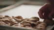 Professional chef puts mushrooms in a line on a baking pan in a commercial kitchen