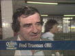 Queen's birthday honours 1989:; ENGLAND: London: Euston Stn:INTCMS Fred Trueman OBE (frmr England cricketer) intvwd SOF- delighted at honour