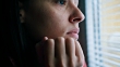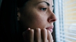 Close-up video of young woman, with tear in her eye, looking thoughtful through the window.