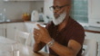 4k video footage of a senior man reading the label on a pill bottle at home