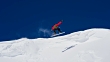 Snowboarder jumping and rotating in air, failing at landing and falling down