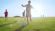 Sport, corsa e calcio da parte dei bambini con la palla al campo per allenamenti, allenamenti o partite. Bambini, fitness e amici o squadra di calcio che si divertono, calciano e liberano, energia o allenamento, placcaggio o esercizio fisico - Video stock 4K