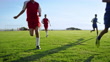 Sports, running and soccer by children with ball at field for practice, training or match. Kids, fitness and friends or football club having fun, kick and free, energy or workout, tackle or exercise
