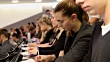 Germany, Munich - October 24, 2016:Close up, slightly tilt up, then slightly zoom out. A female student is in the focus, she´s writing down notes with her pen while sitting in a crowded lecture hall in Munich, Germany.