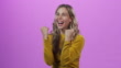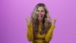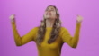 4k video footage of a young woman cheering against a purple studio background
