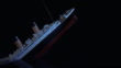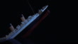 R.M.S Titanic ship just before breaking up and sinking. Half the boat has already sunk, the stern is in the air. Hull lights are on then go out. 1:200 Scale model in water tanks.