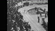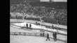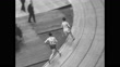 Title "Next Day - Track Carnival" superimposed over track race / looking down on part of track, tiers of seating / runners at starting line for 50-yard dash, people against back wall and spectators above / looking down on race, camera follows sprinters; one falls, Michael Agostini wins / spectators clapping / CU Agostini smiling, his top reads Villanova, spectators in bg / runners begin mile race / looking down on race, spectators / Barthel leading, Wilt close behind / spectators / various shots runners / Wilt passes Barthel / spectators / Barthel passes Wilt and wins / cameraman turns movie camera lenses to camera/ Title card: "Paramount News... The Eyes and Ears of the World ...The End" superimposed over camera image