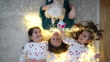 Captured from above, a mother lies on a cozy rug with her playful poodle resting on her, while her two daughters lie nearby in matching white pajamas decorated with small red hearts. Twinkling Christmas lights surround the family, creating a warm, festive, and joyful holiday atmosphere.