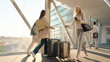 Travel, luggage and phone with business woman at airport for conference trip, networking and communication. Social media, connection and contact with person walking for flight, online and schedule