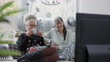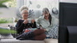Stabilised handheld - Two mature women watching television, coffee break, laughing, smiling, being entertained