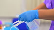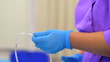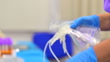 Medical professional wearing gloves carefully assembling a sterile blood bag or a peritoneal dialysis bag in a clean hospital room with a blurred background