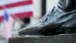 NEW YORK, NY – MARCH 26, 2020: View of the New York Stock Exchange (NYSE) in Wall Street amid the outbreak of the Coronavirus Disease (COVID-19) and a turbulent stock market. The foot of the statue is of a large bronze sculpture of the first President of the United States, George Washington, by John Quincy Adams Ward, installed on the front steps of Federal Hall National Memorial on Wall Street in New York City. (Footage by Tomas Abad/Getty Images)
