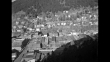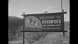 Title card: Western Style Premiere for 'Calamity Jane' / sign on hill 'Welcome to Deadwood, the Historic City, home of Wild Bill Hickok, Preacher Smith, Calamity Jane' / montage aerials town of Deadwood / EXT tavern with log cabin facade and neon signs in windows 'Wines', 'Liquors', sign above entrance 'Bar', and small wooden sign above door 'Where Wild Bill Hickok was shot' with name misspelled / CU sign mentioning Hickok above neon sign 'Bar' / MS wooden sign hanging from chain on building marks historic site where Hickok was shot / CU wooden sign / wooden sign on building; tilt down man wearing Western costume and holstered pistol, presumably dressed as Wild Bill Hickok, leans against outside of building