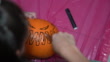 Donna che disegna una faccia su una zucca di Halloween. - Video stock 4K