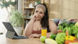 A woman Overweight enjoys a glass of orange juice while watching content on her tablet, surrounded by fresh fruits and vegetables in a comfortable kitchen setting.