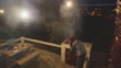 4k video footage of a young woman with long hair with their dog - pug breed enjoying a twilight time relaxing at the patio making burgers on the open fire grill and working by laptop