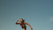 Young woman in bodysuit doing gymnastics in mid-air against blue sky