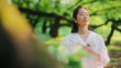 A woman is closing her eyes, doing breathing exercise and meditating in nature.