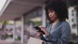 Donna, telefono e borsa della spesa in città scorrono sui social media o sull'app mobile di e-commerce per la vendita al dettaglio, la promozione o lo sconto. Persona birazziale su smartphone per consigli su blog di moda, negozio online o rete 5G - Video stock 4K