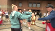 Maud Muir (England rugby union player / World Cup winner), Natasha (Mo) Hunt (England rugby union player / World Cup winner) and Zoe Aldcroft (England rugby union player / World Cup winner) and others singing as they walk along together with one carrying the trophy