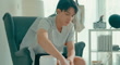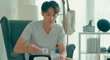 Young Asian man preparing protein shake on sofa in living room at modern home. Diet and healthy food morning routine. - Video stock 4K