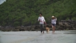 Giovane bella coppia amorevole che gioca con il loro cane al mare. - Video stock HD