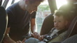 Giovane padre allacciare il sedile del figlio bealt - Video stock 4K