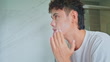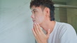 Young man washing his face with a facial cleanser in front of mirror in the bathroom at home. Healthy lifestyle in morning routine concept.