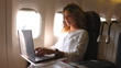 Young woman working on her laptop looking very cheerful before takeoff riding in first class - Lifestyles